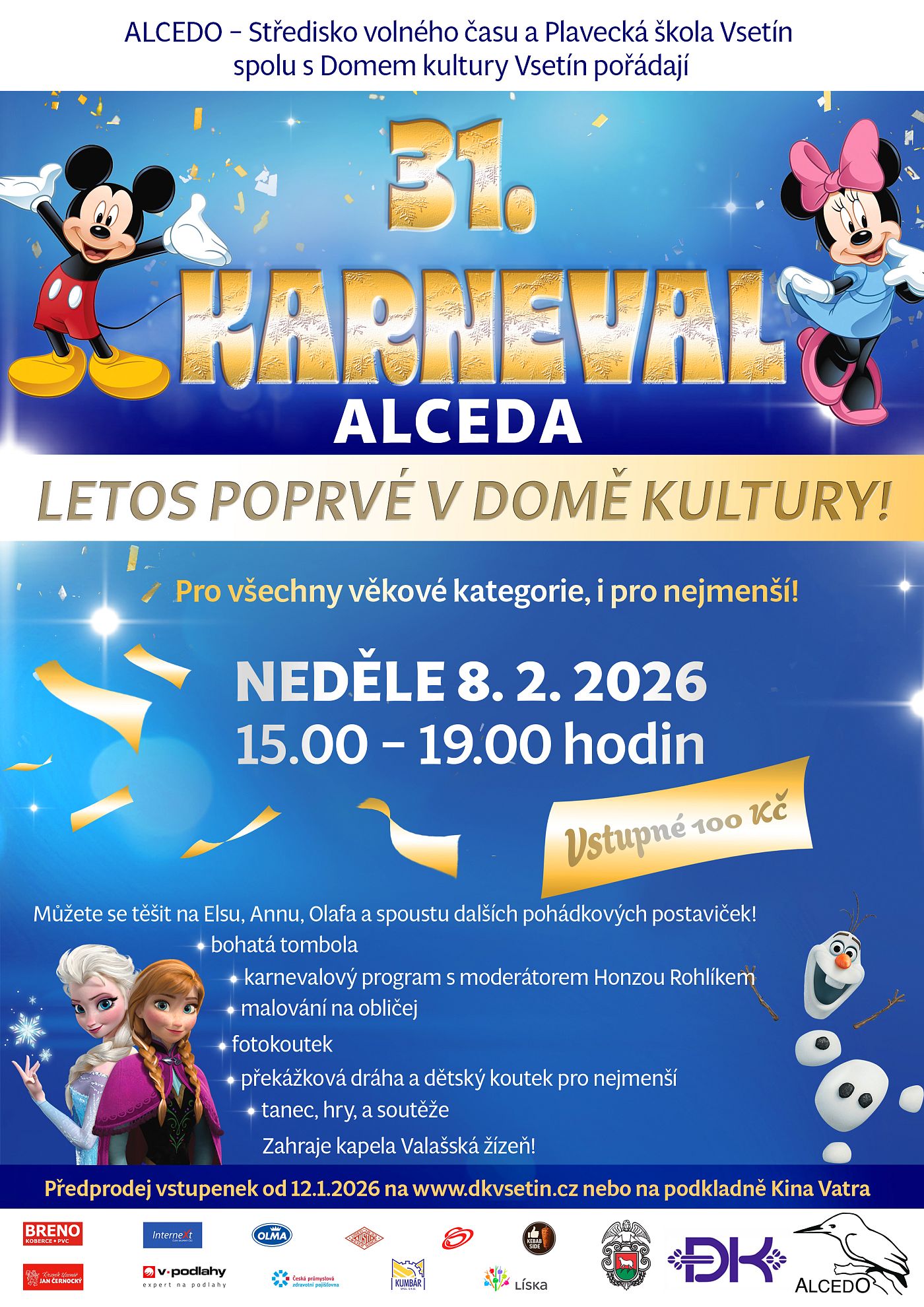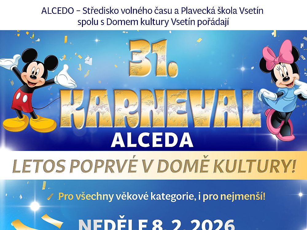 V neděli 8. února 2026 od 15.00 do 19.00 hodin ožije Dům kultury Vsetín už 31. ročníkem tradičního Karnevalu Alceda, který se letos poprvé koná ve spolupráci s Domem kultury Vsetín.