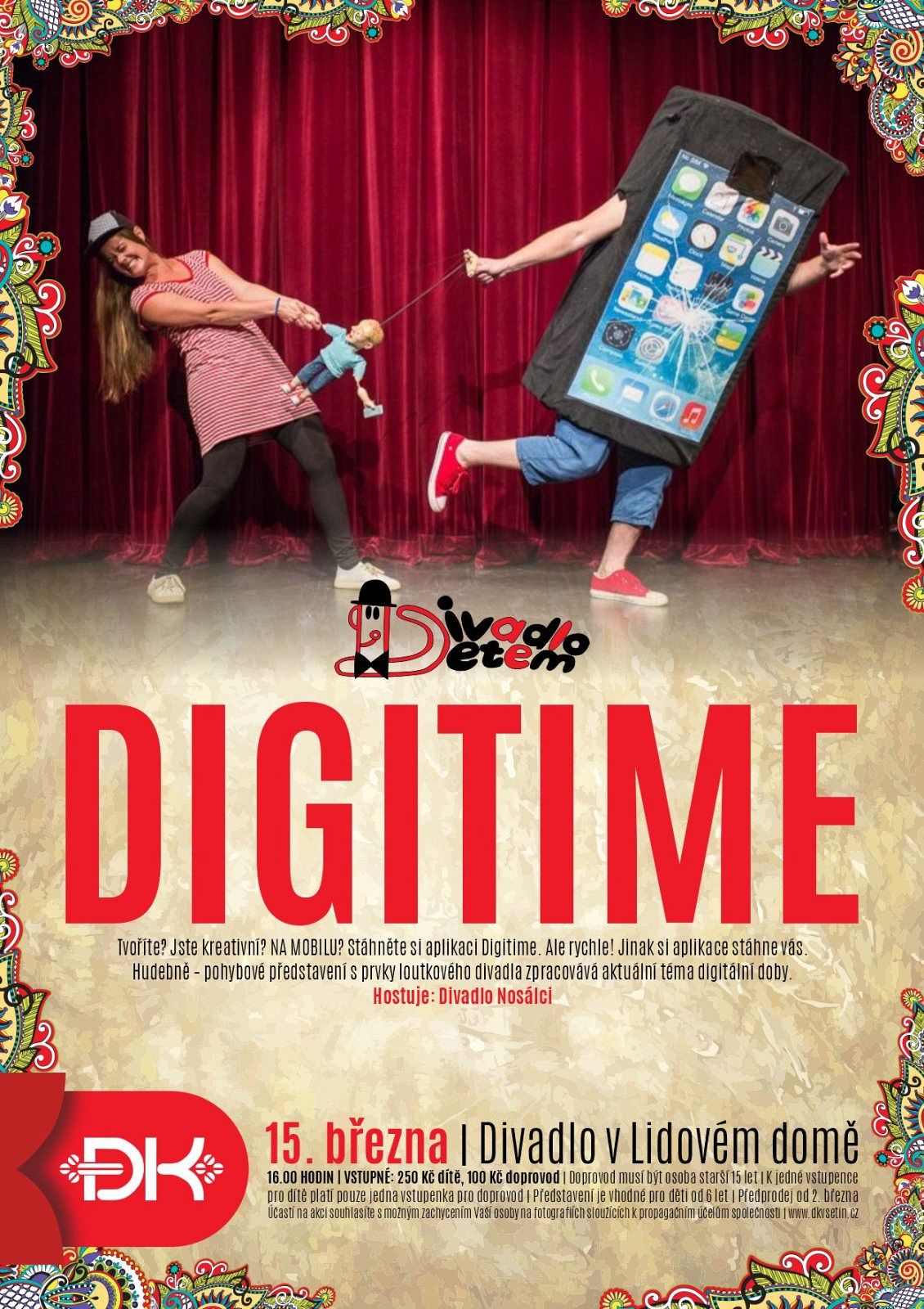 Cyklus Divadlo dětem nabídne v březnu další představení pro mladé diváky. V neděli 15. března od 16 hodin se v Divadle v Lidovém domě odehraje inscenace Digitime v podání hostujícího souboru Divadlo Nosálci. Představení zpracovává aktuální téma digitální doby a propojuje hudební, pohybové a loutkové divadlo. Zaměřeno je především na děti školního věku.