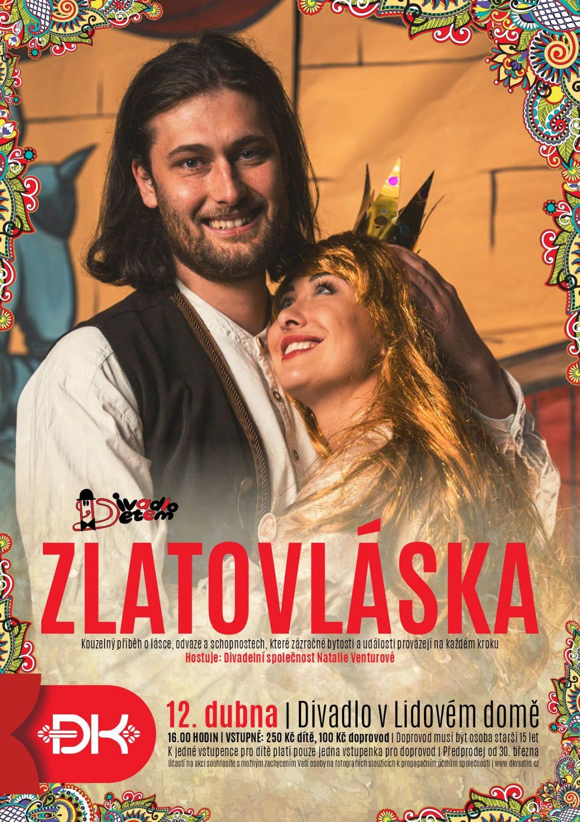 Divadlo dětem přinese další představení pro mladé publikum. V neděli 12. dubna od 16 hodin se v Divadle v Lidovém domě odehraje pohádková inscenace Zlatovláska v podání hostující Divadelní společnosti Natalie Venturové. Oblíbený příběh plný kouzel, dobrodružství a lásky je určen dětem školního i předškolního věku.
