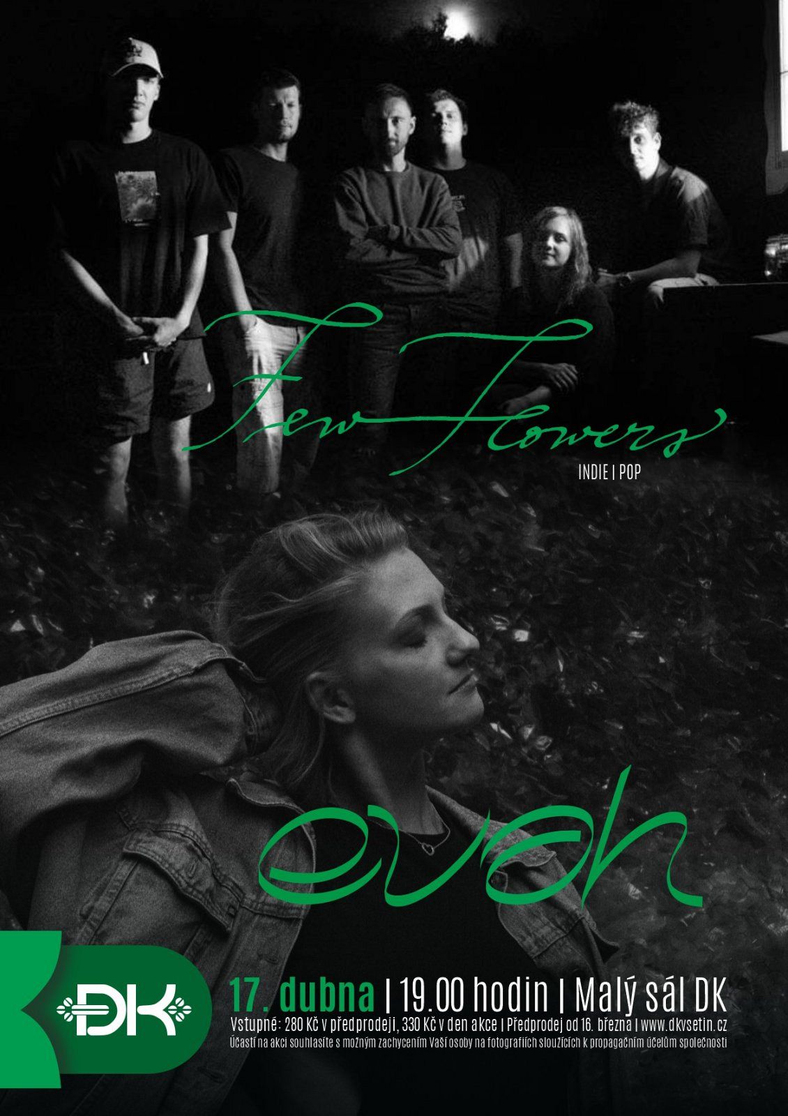 Malý sál Domu kultury Vsetín nabídne v pátek 17. dubna od 19 hodin večer plný současné české indie a popové hudby. Na společném koncertě vystoupí valašská kapela Few Flowers a olomoucká zpěvačka a songwriterka Evah.