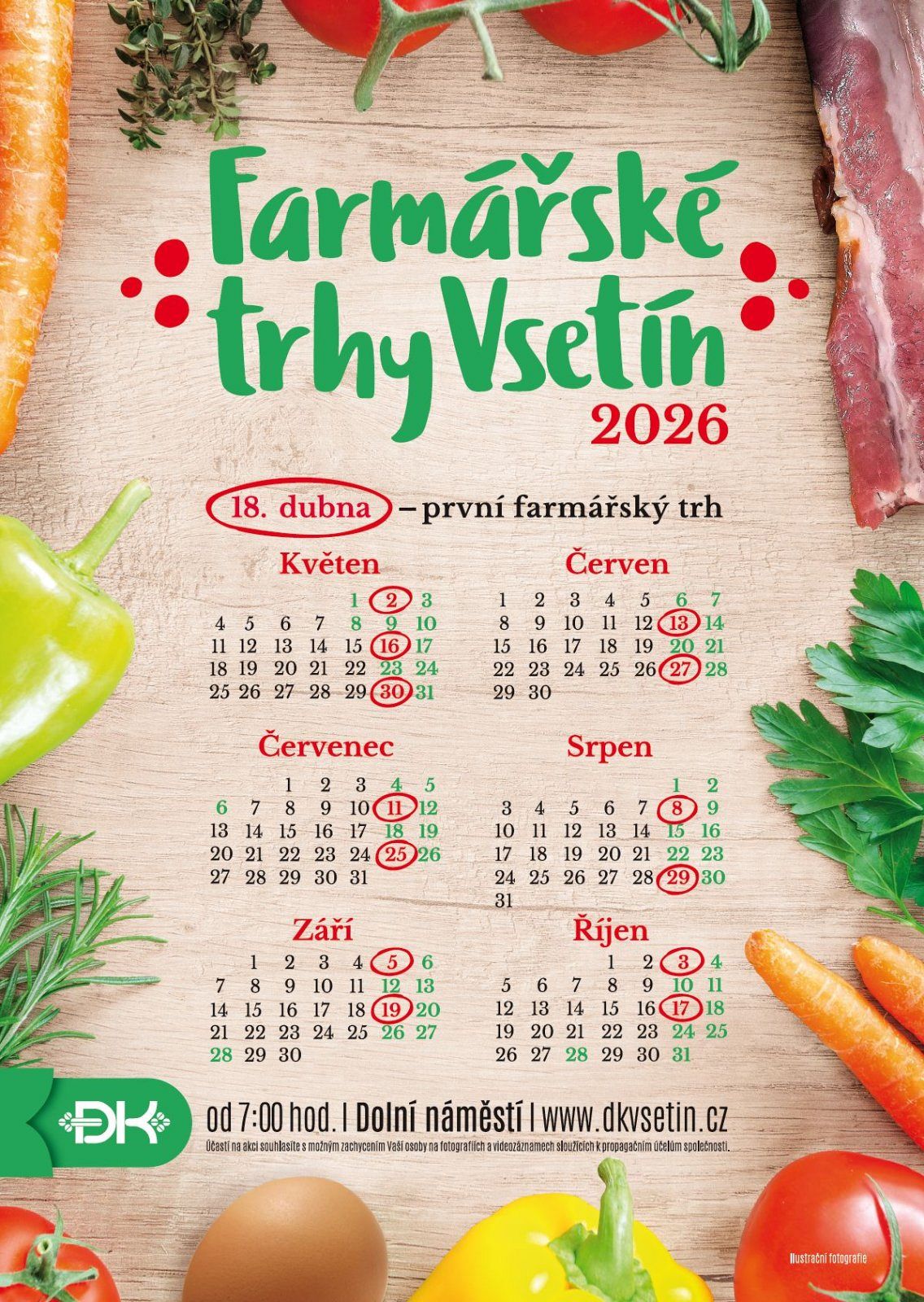 Tradiční farmářské trhy se i v roce 2026 vrátí na Dolní náměstí. Pro letošní sezónu připravil Dům kultury Vsetín ve spolupráci s městem Vsetín celkem čtrnáct sobotních termínů od dubna do října. První farmářský trh se uskuteční v sobotu 18. dubna 2026 tradičně v dopoledním čase od 7 hodin.