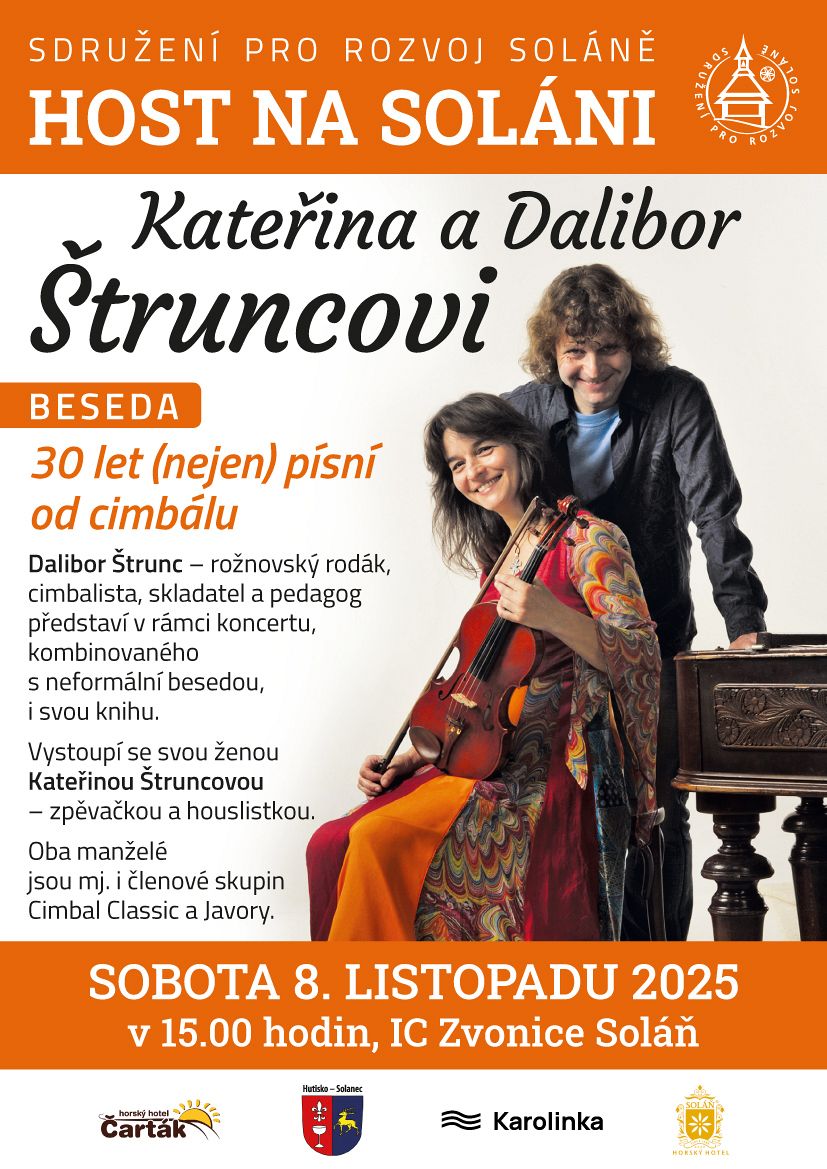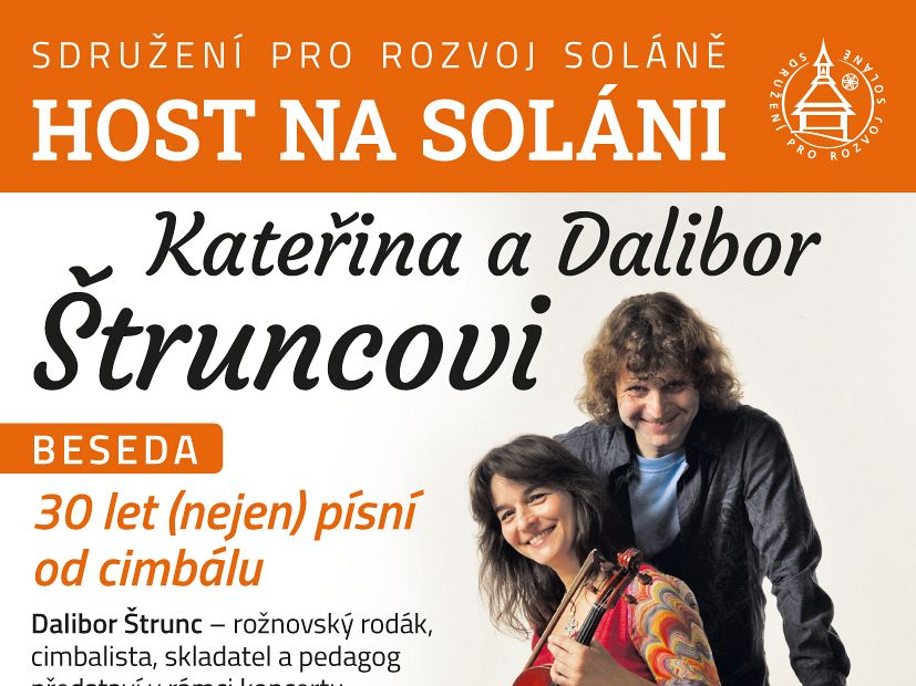 Beseda 30 let (nejen) písní od cimbálu se bude konat 8. listopadu od 15 hodin s manžely Kateřinou a Daliborem Štruncovými, kteří jsou členové skupin Cimbal Classic a Javory.