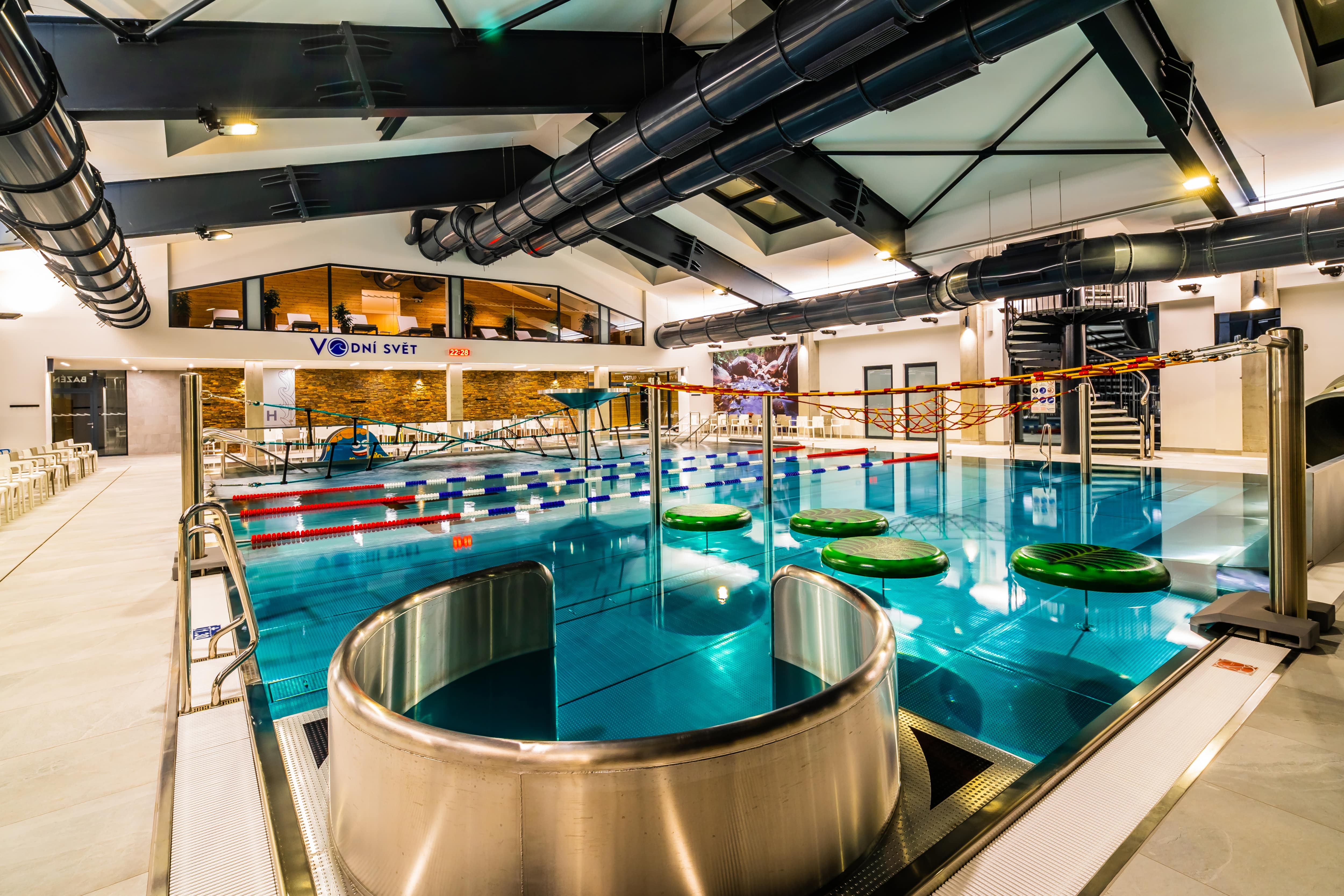 Ve Vodním světě si užijete zábavu ve vodě s partnerem, kámoškou i celou rodinou. Vyzkoušet si můžete bazén s délkou téměř 16 metrů, 50 metrů dlouhý světelný tobogán, vodní masážní lehátka, chrliče, perličky, lanové prvky a houpací záliv, vlnobití, dětský bazén se skluzavkou a dalšími vodními prvky nebo relaxační whirpool bazén. Ve vybraných dnech si můžete užít aqua aerobik a další aktivity. Součástí Vodního světa je i bistro, kde si po celý den můžete vybírat z nabídky jídel, dezertů a nealkoholických i alkoholických nápojů.