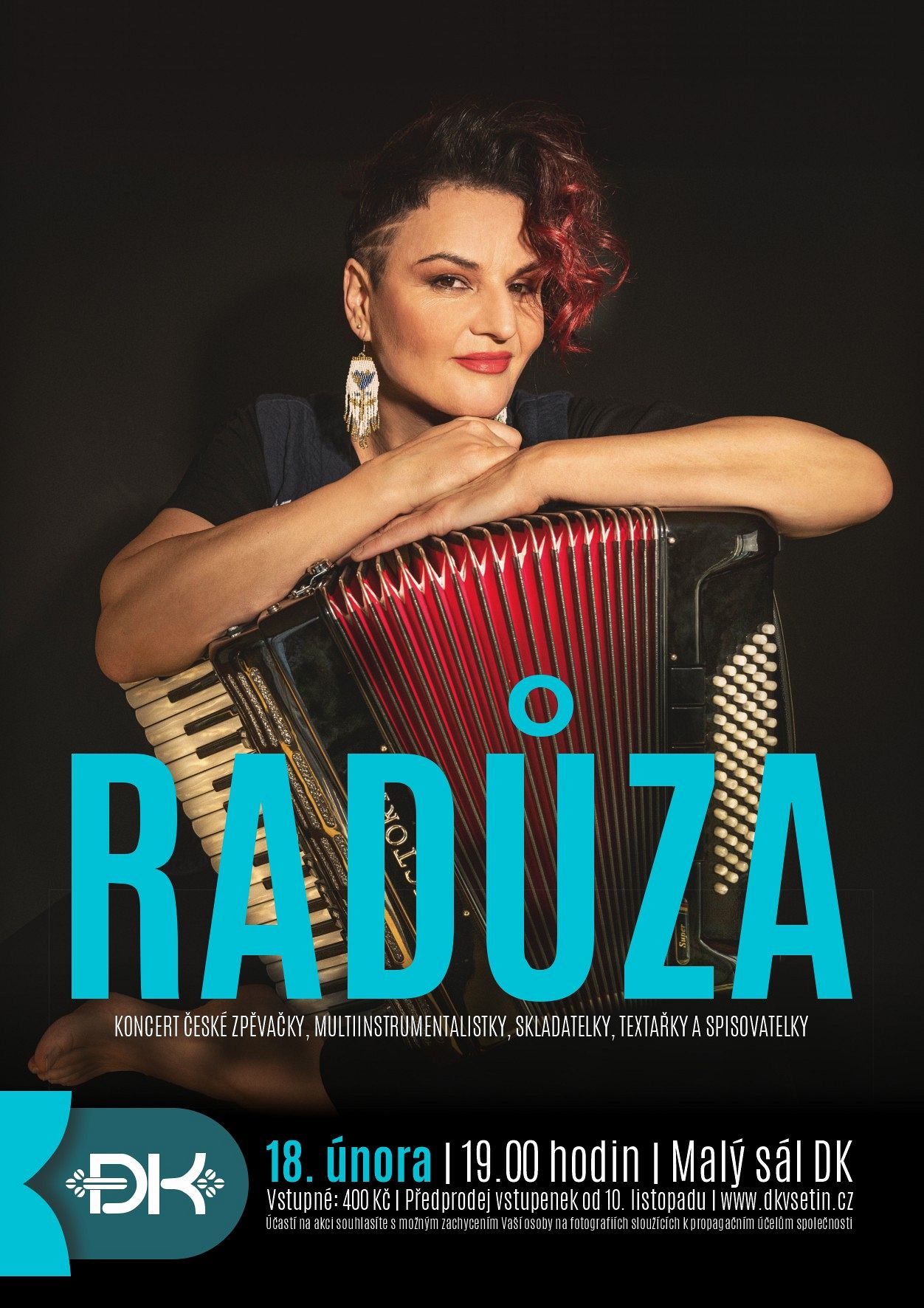 Ve středu 18. února 2026 od 19 hodin zazní v malém sále Domu kultury Vsetín písně Radůzy – zpěvačky, multiinstrumentalistky, skladatelky, textařky a spisovatelky. Publikum se může těšit na osobitou poetiku, silný hlas a příjemný hudební zážitek v komorní atmosféře.